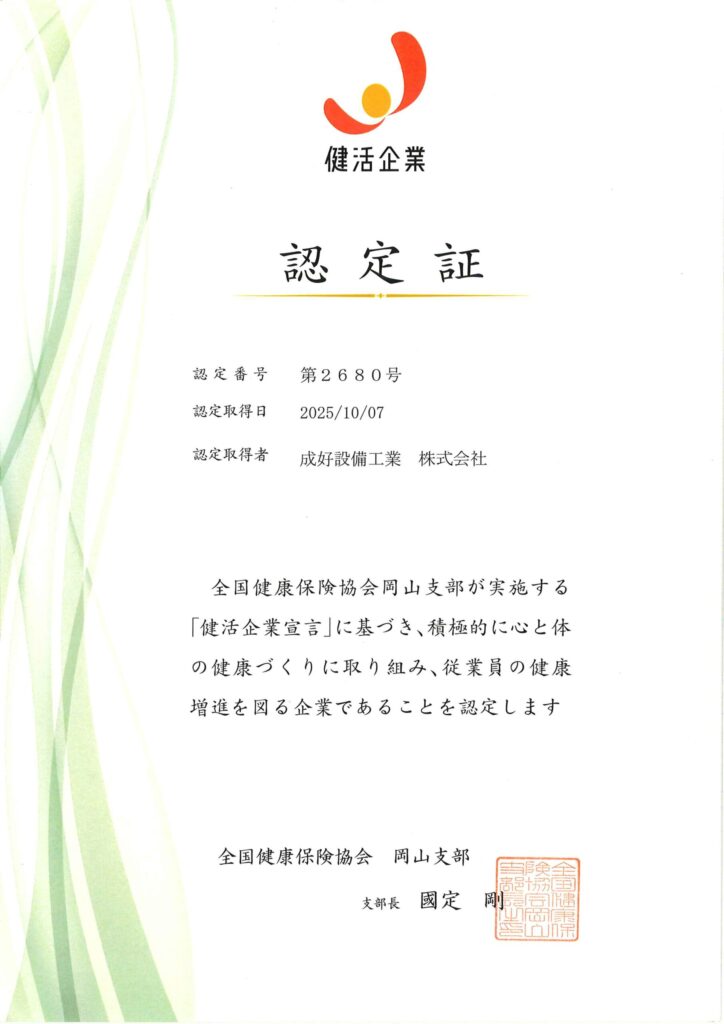 健活企業に認定されました 2025年10月16日 by 成好設備工業株式会社 / 0件のコメント この度、『健活企業』に認定されました。 積極的に従業員の健康づくりに取り組み、健康増進を行う企業として、引き続き努めてまります。 成好設備工業株式会社 創業75年目、岡山県北で業界最も歴史がある会社です。 技術力と施工実績が強みです!